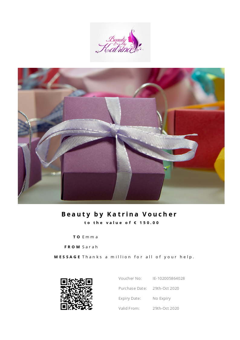 Beauty by Katrina allows you to purchase instantly printable gift vouchers, special offers and tickets using the Voucher Connect platform.